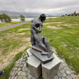 It was cold and rainy as we put on our 'waterproof' suits and made our way down the rocky trail to the boats. Our captain was pretty cool and happy to have a private tour. We meandered our way through the lagoon, admiring the white and blue sculpture like icebergs. As we approached the glacier wall, we heard the ice calving (falling) into the water. We learned about the age of the ice, seeing the larger bubbles against the smaller more sparse air pockets in a chunk of ice our guide scooped out of the water for us. He emphasized the melting rate of the glaciers, and I can only imagine that us riding around in a boat, forcing water to lap at the glacier wall was not helping the situation. Ted was grumpy again, not sure why again either. Azlan and I walked behind him and Jovan (our captain) trying not to irritate him more. When we took off our 'waterproof' gear, poor Azlan's pants were wet. Maybe Ted was mad because Azlan kept trying to get really close to him on the boat and that he was stuck on a boat with no control over the situation. Azlan didn't complain though, that is a huge win for everyone involved! We grabbed some hot chocolates and coffees and drove to Seyðisfjörður. It was a long 4 and a half hour drive on the narrow, mostly paved, ring road. We had to slow down for the recurring one-way bridges and be alert of other drivers as they were few and far between. Vigilance of suicidal sheep ready to dart in front of the vehicle without notice was also paramount! It was on this drive that we saw the Islandic landscape we had imagined. Tall mountains carved by years of harsh weather, waterfalls drawn into almost every crevice, snow dotting the higher ridges. Our journey was partitioned with many stops, including a black sand beach after lunch to stretch our legs. I had to pee but other people pulled onto the beach and there are no trees, boulders, or hills to hide behind, so we move on. We see what looks like a trail head parking spot and stop to investigate. 2 men share that the hike is an hour around the waterfall and well worth it. I run past them and up the trail a bit to make a waterfall of my own. Azlan is ahead of us, so Ted and I decide to make the hike. Nykurhylsfoss did not disappoint. This was the best hike of the trip! It was remote, off the beaten path, had stunning views, and ended with us hopping over a gate and sneaking past a disgruntled sheep and her babies. A snowball fight highlighted our next stop as we wound through the fjords, through the towering hills, and over the snowcapped mountains. The weather reversed and we saw some much-needed blue skies. We arrived at the Seydisfjordur Guesthouse around 5pm, this was the other new hotel GTI got for us but one room was a double and the other a single. This time I bunked with Azlan as the double room had a bathroom and the single did not. This was more of a B&B type arrangement with a shared kitchen, but no breakfast included. We dropped our bags off and went exploring to find the rainbow painted pathway in town. There were a group of kids playing by the water, one little girl ran and jumped into the water of the fjord - her skin flashing bright red from the cold as she came out. After 3 tries we found a place for dinner and then followed Ted on a path past our 'hotel' to find the Tvísöngur Sound Sculpture. I was seemingly grumpy on the hike up...maybe because it was 7pm, I was tired, and I was in sneakers on a hike that clearly called for boots. We made it to the sound sculpture where we sang in the different domes (thank goodness no one was around to hear our orchestra) and took some pictures. The trail kept going and crossed the 3 beautiful waterfalls behind the guesthouse. I opted to turn back with Azlan for showers, symmetry exercises, and hopefully an earlier bedtime. Ted ventured off into the unknown, finding a check in register (some paper and a pen in a waterproof pouch stuffed into a waterproof tube), a random electrical cable, and spectacular views. He really enjoyed himself and I'm so glad he got to do it!