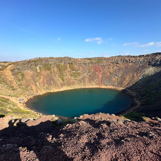 As we hit the road, Ted and I commented to each other that the terrain we were seeing in Iceland was not what we expected. Low rolling mossy hills and small random solitary mountains in the distance delineated the landscape. Our first stop was Thingvellier National Park where the North American and Eurasian Tectonic Plates meet. We had enough time for a short hike around the mostly baren park, saw a little church, got carried away with pictures and videos, and high-tailed it back to the car. Our activity of the day was Snowmobiling on Langjokull Glacier and we had a meeting time to make! Snomobile.is picked us up promptly outside Skjol Camping Cafe, just as we finished some fantastic French fries and mushroom soup. We boarded a 'Super Jeep' - effectively a passenger van on colossal tires - and headed to the highlands to get suited up for our adventure. It was a bumpy ride on a rocky dirt road and Ted slept happily while I grumbled under my breath that I should have worn my tightest sports bra. How Azlan read his book during the 45 min ride, I have no idea! When we arrived at the outpost, we all got ski suits, balaclavas, gloves, goggles, helmets, and a much-needed pee break. Upon arriving at the snowmobiles 10 mins later, one of our 3 guides gave our group a block of instruction on how to operate them, Azlan jumped on Ted's snowmobile, and we were off! We dashed through the snow heading towards a white abyss, the second largest ice cap in Iceland. We zoomed in a straight line following our guide for about 20 mins at about half speed when someone from our group overtook me going what I thought was full speed. They zoomed in front of me, ice shards from fresh snow sliced at my googles. Mo$%$#&^*(er! All good though, it’s an adventure after all! We stopped for a 10 min picture break where we watched a helicopter hovering on the glacier about a kilometer away. Turns out an older gentleman broke his leg snowmobiling with another company and was getting air lifted, yikes! We jumped on the snowmobiles; testing turns and speeds on our way back. Azlan's gloves and boots were completely soaked through, and we understood then why he had been complaining so much about being cold! Note to self: never ride on the back of a snowmobile unless you wrap your boots and gloves in 100% heavy-duty waterproof plastic! We were treated to some cookies and cold water (they forgot to turn on the water boiler for the tea) and then rode the cracked-out Jeep back to the Skjol Cafe, stopping for 10 mins to inflate the massive tires on the way. When we got off the Jeep, Ted confirmed he got everything so we hopped in the car and moved onto our next destination - the Geysir Geothermal Area. Here we watched steam drifting into the cold air, pools of boiling water seeping into the landscape, and a predictable geyser shooting up water about every 5-10 mins. After that we moved up the road to one of the Golden Circle's most famous vistas - the Gullfoss Waterfall. Fortunately, blessed with a sunny day, we witnessed a spectacular rainbow over the 105-foot double decker waterfall. Our final stop for the day was the Kerid Crater, a 3000 year old crater measuring 866 feet by 558 feet with a pool of blue-green water filling the bottom of the red rocked caldera. Ted showed-off his rock skipping skills as we skirted the water's edge after a short hike down into the basin.